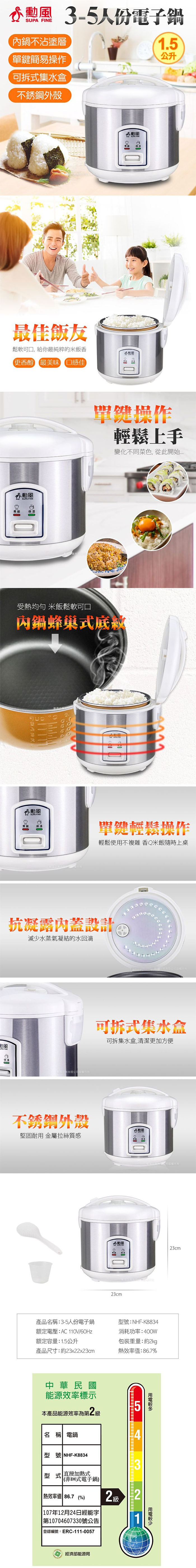 【勳風】3-5人份家庭用電子鍋(白) NHF-K8834 電子鍋 電飯鍋