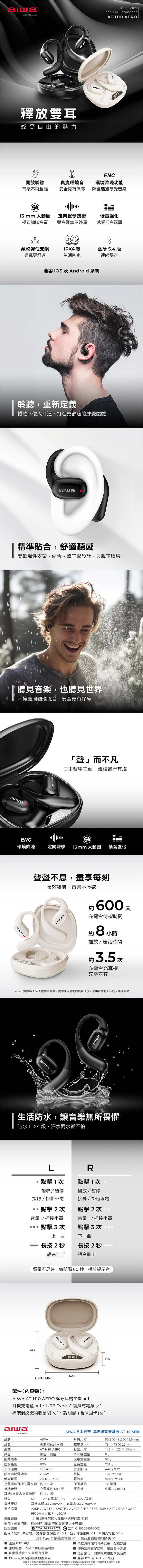 【AIWA 愛華】真無線藍牙耳機 AT-H10 AERO 黑色 / 白色 藍牙耳機 無線耳機