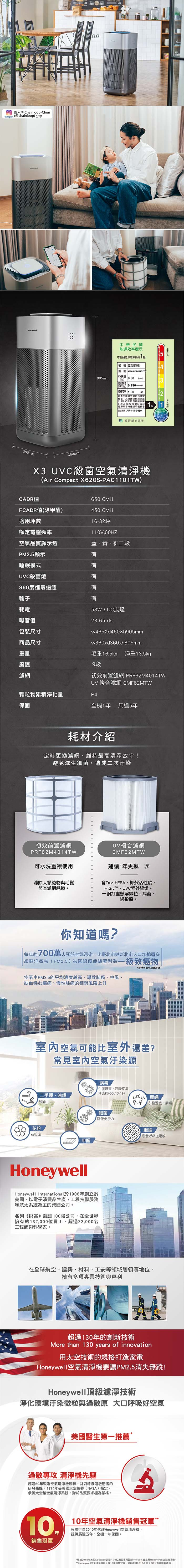 美國 Honeywell X3 UVC殺菌空氣清淨機 X620S-PAC1101TW (X620S) 原廠公司貨