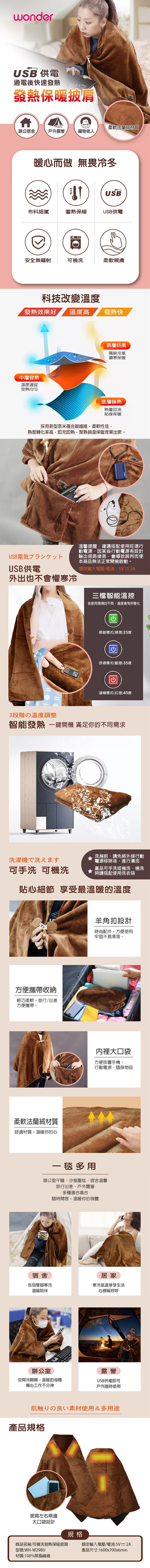 【WONDER 旺德】 可機洗發熱保暖披肩 WH-W29BU 沙發蓋毯 可機洗 行動電源供電